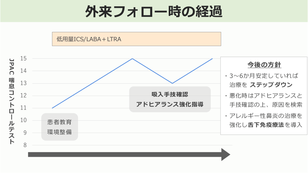 #19. 外来フォロー時の経過 低⽤量ICS/LABA+LTRA JPAC 喘 息 コ ン ト ロ ' ル テ ス ト 15 今後の⽅針 14 ・3〜6か⽉安定していれば 13 治療を ステップダウン 12 吸⼊⼿技確認 11 アドヒアランス強化指導 10 患者教育 9 環境整備 8 ・悪化時はアドヒアランスと ⼿技確認の上、原因を検索 ・アレルギー性⿐炎の治療を 強化し⾆下免疫療法を導⼊
