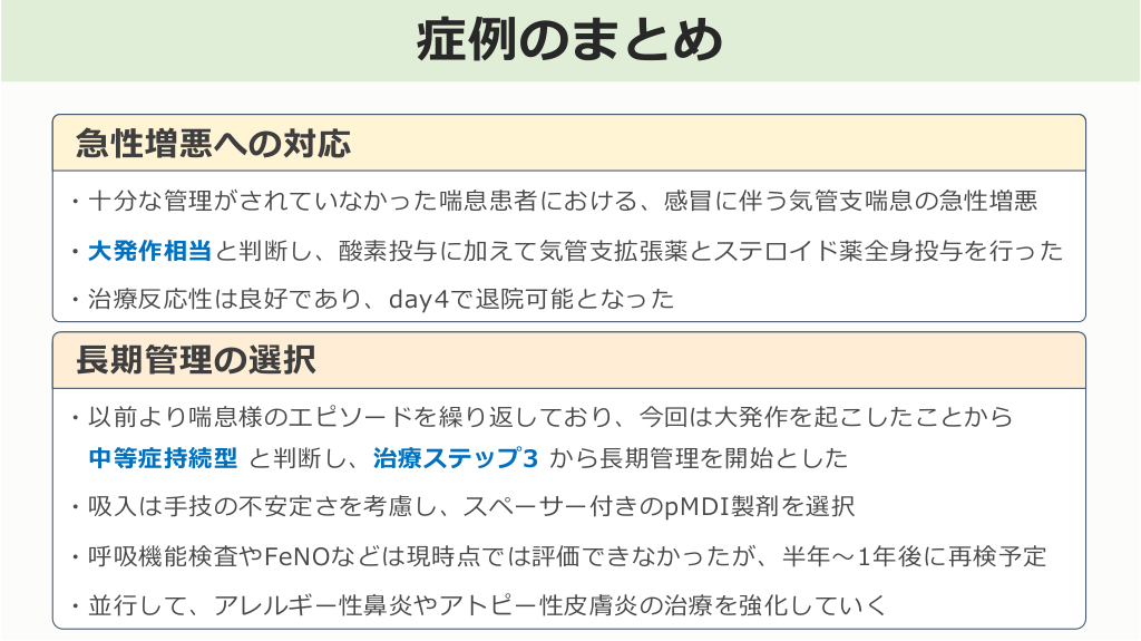 #20. 症例のまとめ 急性増悪への対応 ・⼗分な管理がされていなかった喘息患者における、感冒に伴う気管⽀喘息の急性増悪 ・⼤発作相当と判断し、酸素投与に加えて気管⽀拡張薬とステロイド薬全⾝投与を⾏った ・治療反応性は良好であり、day4で退院可能となった ⻑期管理の選択 ・以前より喘息様のエピソードを繰り返しており、今回は⼤発作を起こしたことから 中等症持続型 と判断し、治療ステップ3 から⻑期管理を開始とした ・吸⼊は⼿技の不安定さを考慮し、スペーサー付きのpMDI製剤を選択 ・呼吸機能検査やFeNOなどは現時点では評価できなかったが、半年〜1年後に再検予定 ・並⾏して、アレルギー性⿐炎やアトピー性⽪膚炎の治療を強化していく