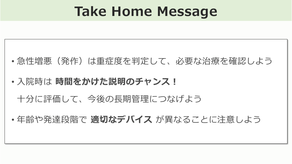 #21. Take Home Message • 急性増悪(発作)は重症度を判定して、必要な治療を確認しよう • ⼊院時は 時間をかけた説明のチャンス︕ ⼗分に評価して、今後の⻑期管理につなげよう • 年齢や発達段階で 適切なデバイス が異なることに注意しよう
