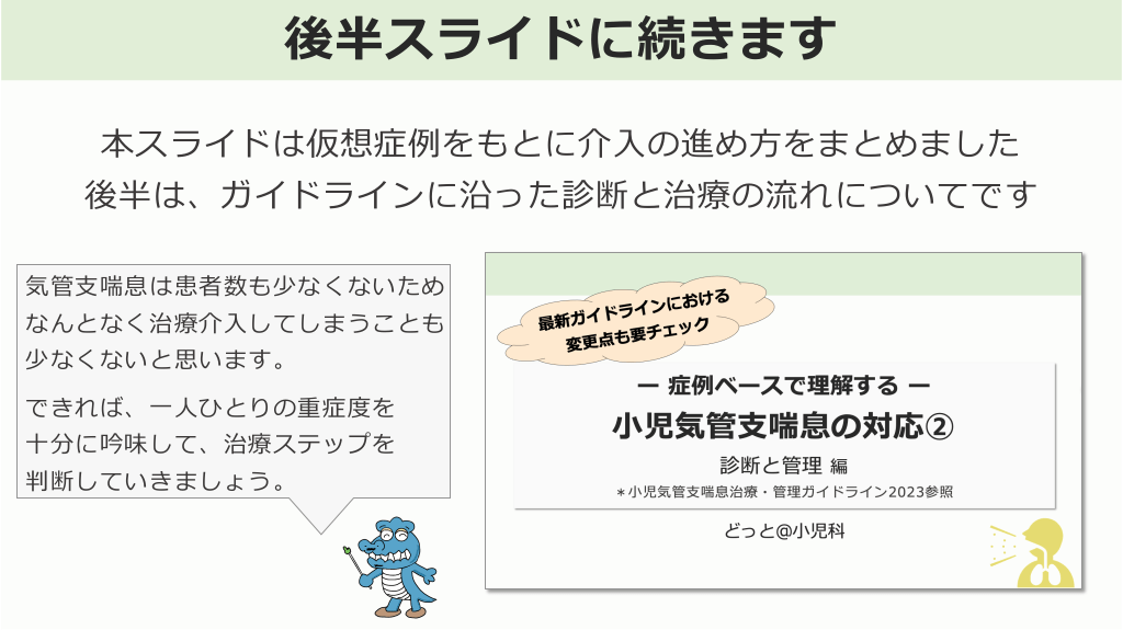 #22. 後半スライドに続きます 本スライドは仮想症例をもとに介⼊の進め⽅をまとめました 後半は、ガイドラインに沿った診断と治療の流れについてです 気管⽀喘息は患者数も少なくないため なんとなく治療介⼊してしまうことも 少なくないと思います。 できれば、⼀⼈ひとりの重症度を ⼗分に吟味して、治療ステップを 判断していきましょう。