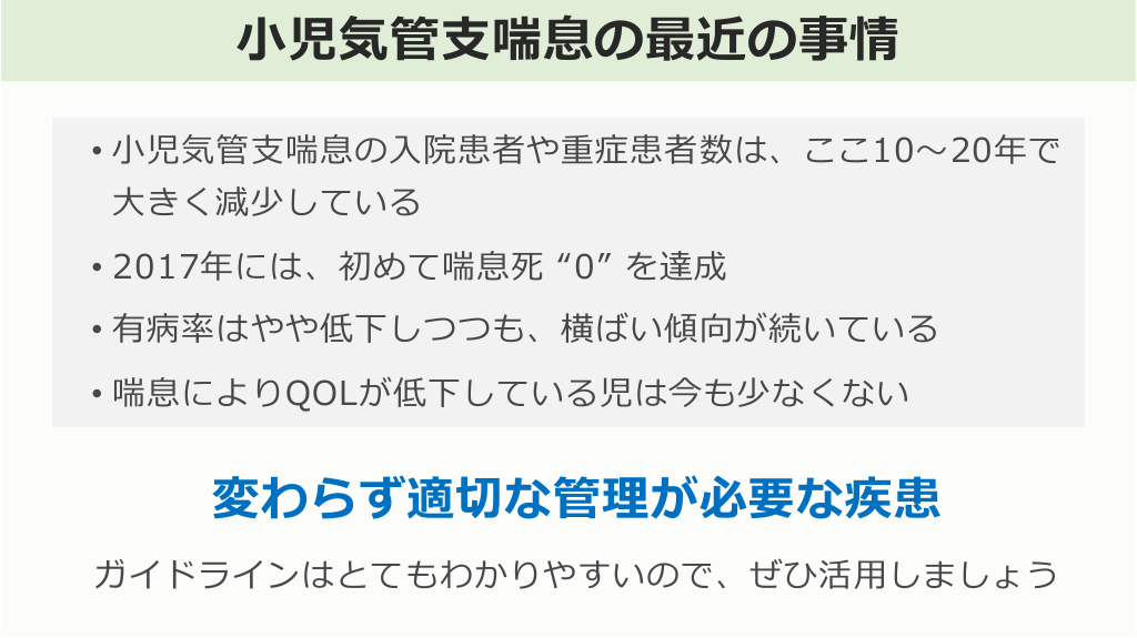 #3. ⼩児気管⽀喘息の最近の事情 • ⼩児気管⽀喘息の⼊院患者や重症患者数は、ここ10〜20年で ⼤きく減少している • 2017年には、初めて喘息死 “0” を達成 • 有病率はやや低下しつつも、横ばい傾向が続いている • 喘息によりQOLが低下している児は今も少なくない 変わらず適切な管理が必要な疾患 ガイドラインはとてもわかりやすいので、ぜひ活⽤しましょう