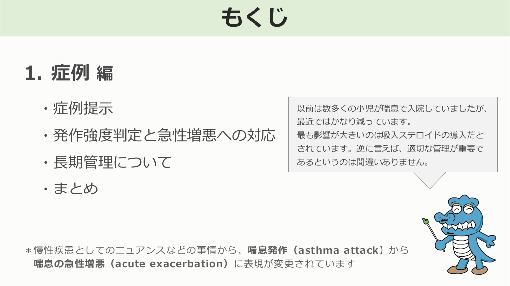 #4. もくじ 1. 症例 編 ・症例提⽰ 以前は数多くの⼩児が喘息で⼊院していましたが、 ・発作強度判定と急性増悪への対応 最も影響が⼤きいのは吸⼊ステロイドの導⼊だと ・⻑期管理について 最近ではかなり減っています。 されています。逆に⾔えば、適切な管理が重要で あるというのは間違いありません。 ・まとめ *慢性疾患としてのニュアンスなどの事情から、喘息発作(asthma attack)から 喘息の急性増悪(acute exacerbation)に表現が変更されています