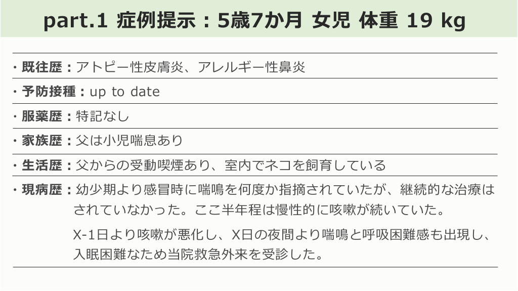 #5. part.1 症例提⽰︓5歳7か⽉ ⼥児 体重 19 kg ・既往歴︓アトピー性⽪膚炎、アレルギー性⿐炎 ・予防接種︓up to date ・服薬歴︓特記なし ・家族歴︓⽗は⼩児喘息あり ・⽣活歴︓⽗からの受動喫煙あり、室内でネコを飼育している ・現病歴︓幼少期より感冒時に喘鳴を何度か指摘されていたが、継続的な治療は されていなかった。ここ半年程は慢性的に咳嗽が続いていた。 X-1⽇より咳嗽が悪化し、X⽇の夜間より喘鳴と呼吸困難感も出現し、 ⼊眠困難なため当院救急外来を受診した。