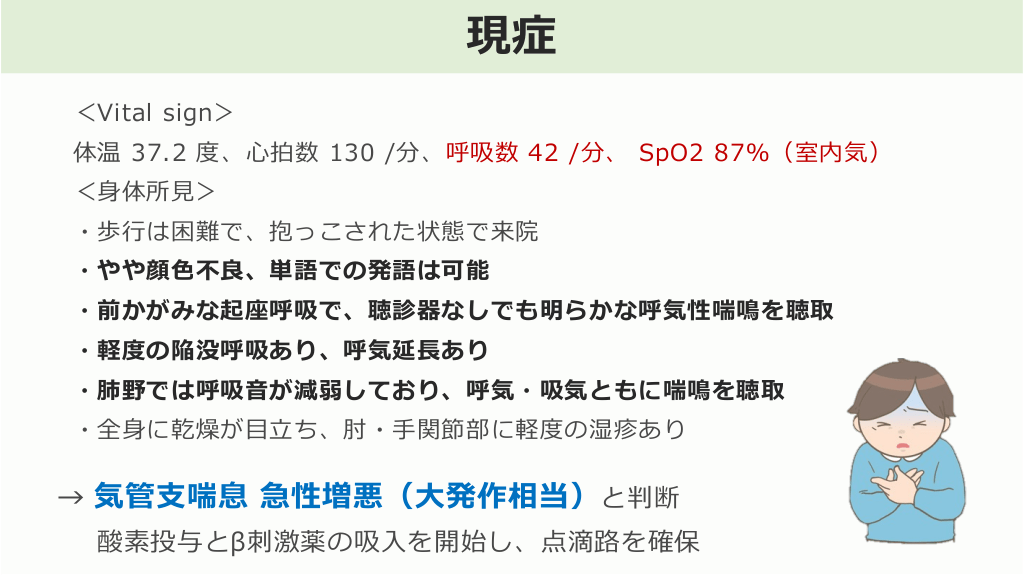 #6. 現症 <Vital sign> 体温 37.2 度、⼼拍数 130 /分、呼吸数 42 /分、 SpO2 87%(室内気) <⾝体所⾒> ・歩⾏は困難で、抱っこされた状態で来院 ・やや顔⾊不良、単語での発語は可能 ・前かがみな起座呼吸で、聴診器なしでも明らかな呼気性喘鳴を聴取 ・軽度の陥没呼吸あり、呼気延⻑あり ・肺野では呼吸⾳が減弱しており、呼気・吸気ともに喘鳴を聴取 ・全⾝に乾燥が⽬⽴ち、肘・⼿関節部に軽度の湿疹あり → 気管⽀喘息 急性増悪(⼤発作相当) と判断 酸素投与とβ刺激薬の吸⼊を開始し、点滴路を確保