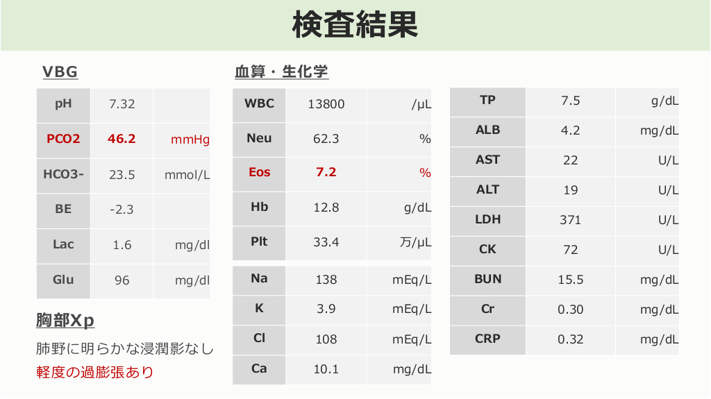 #7. 検査結果 VBG ⾎算・⽣化学 pH 7.32 PCO2 46.2 HCO3- 23.5 BE -2.3 Lac 1.6 Glu 96 mmHg 13800 Neu 62.3 /μL % TP 7.5 g/dL ALB 4.2 mg/dL AST 22 U/L ALT 19 U/L LDH 371 U/L CK 72 U/L Eos 7.2 % Hb 12.8 g/dL mg/dl Plt 33.4 万/μL mg/dl Na 138 mEq/L BUN 15.5 mg/dL K 3.9 mEq/L Cr 0.30 mg/dL Cl 108 mEq/L CRP 0.32 mg/dL Ca 10.1 mg/dL mmol/L 胸部Xp 肺野に明らかな浸潤影なし 軽度の過膨張あり WBC