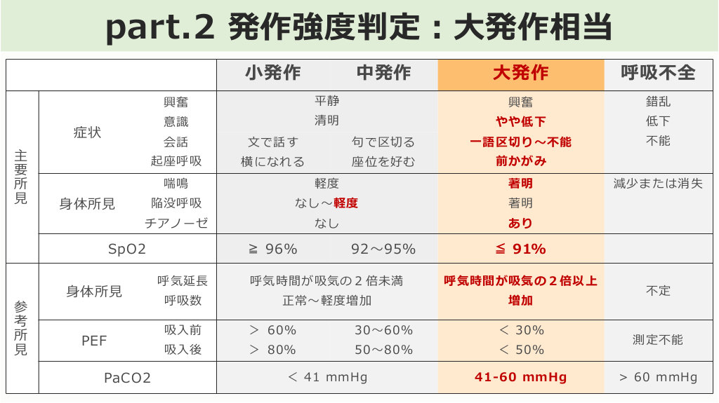 #8. part.2 発作強度判定︓⼤発作相当 ⼩発作 症状 主 要 所 ⾒ ⼤発作 呼吸不全 興奮 平静 興奮 錯乱 意識 清明 やや低下 低下 不能 会話 ⽂で話す 句で区切る ⼀語区切り〜不能 起座呼吸 横になれる 座位を好む 前かがみ 喘鳴 軽度 著明 陥没呼吸 なし〜軽度 著明 チアノーゼ なし あり ⾝体所⾒ SpO2 参 考 所 ⾒ 中発作 ⾝体所⾒ PEF PaCO2 ≧ 96% 92〜95% ≦ 91% 呼気延⻑ 呼気時間が吸気の2倍未満 呼気時間が吸気の2倍以上 呼吸数 正常〜軽度増加 増加 吸⼊前 > 60% 30〜60% < 30% 吸⼊後 > 80% 50〜80% < 50% < 41 mmHg 減少または消失 41-60 mmHg 不定 測定不能 > 60 mmHg