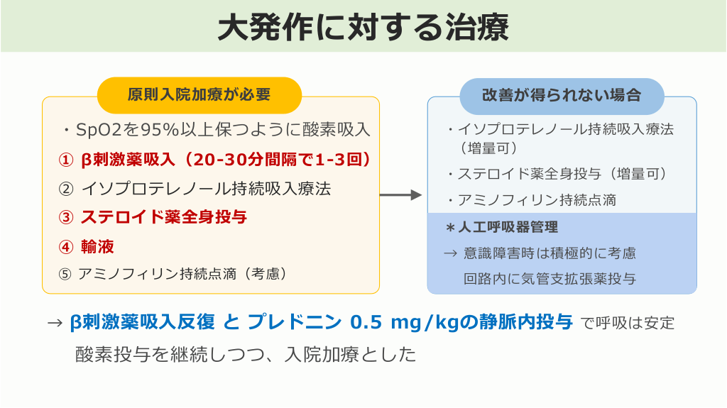 #9. ⼤発作に対する治療 原則⼊院加療が必要 ・SpO2を95%以上保つように酸素吸⼊ ① β刺激薬吸⼊(20-30分間隔で1-3回) ② イソプロテレノール持続吸⼊療法 ③ ステロイド薬全⾝投与 ④ 輸液 ⑤ アミノフィリン持続点滴(考慮) → 改善が得られない場合 ・イソプロテレノール持続吸⼊療法 (増量可) ・ステロイド薬全⾝投与(増量可) ・アミノフィリン持続点滴 *⼈⼯呼吸器管理 → 意識障害時は積極的に考慮 回路内に気管⽀拡張薬投与 β刺激薬吸⼊反復 と プレドニン 0.5 mg /kgの静脈内投与 で呼吸は安定 酸素投与を継続しつつ、⼊院加療とした