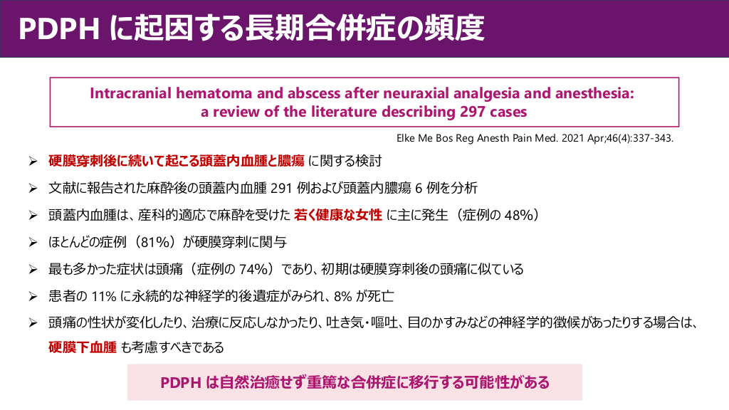 #10. PDPH に起因する長期合併症の頻度 Intracranial hematoma and abscess after neuraxial analgesia and anesthesia: a review of the literature describing 297 cases Elke Me Bos Reg Anesth Pain Med. 2021 Apr;46(4):337-343. ➢ 硬膜穿刺後に続いて起こる頭蓋内血腫と膿瘍 に関する検討 ➢ 文献に報告された麻酔後の頭蓋内血腫 291 例および頭蓋内膿瘍 6 例を分析 ➢ 頭蓋内血腫は、産科的適応で麻酔を受けた 若く健康な女性 に主に発生(症例の 48%) ➢ ほとんどの症例(81%)が硬膜穿刺に関与 ➢ 最も多かった症状は頭痛(症例の 74%)であり、初期は硬膜穿刺後の頭痛に似ている ➢ 患者の 11% に永続的な神経学的後遺症がみられ、8% が死亡 ➢ 頭痛の性状が変化したり、治療に反応しなかったり、吐き気・嘔吐、目のかすみなどの神経学的徴候があったりする場合は、 硬膜下血腫 も考慮すべきである PDPH は自然治癒せず重篤な合併症に移行する可能性がある