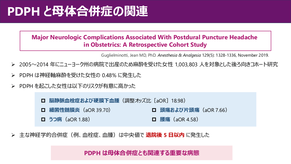 #11. PDPH と母体合併症の関連 Major Neurologic Complications Associated With Postdural Puncture Headache in Obstetrics: A Retrospective Cohort Study Guglielminotti, Jean MD, PhD. Anesthesia & Analgesia 129(5): 1328-1336, November 2019. ➢ 2005〜2014 年にニューヨーク州の病院で出産のため麻酔を受けた女性 1,003,803 人を対象とした後ろ向きコホート研究 ➢ PDPH は神経軸麻酔を受けた女性の 0.48% に発生した ➢ PDPH を起こした女性は以下のリスクが有意に高かった 脳静脈血栓症および硬膜下血腫(調整オッズ比[aOR]18.98) 細菌性髄膜炎(aOR 39.70) 頭痛および片頭痛(aOR 7.66) うつ病(aOR 1.88) 腰痛(aOR 4.58) ➢ 主な神経学的合併症(例、血栓症、血腫)は中央値で 退院後 5 日以内 に発生した PDPH は母体合併症とも関連する重要な病態