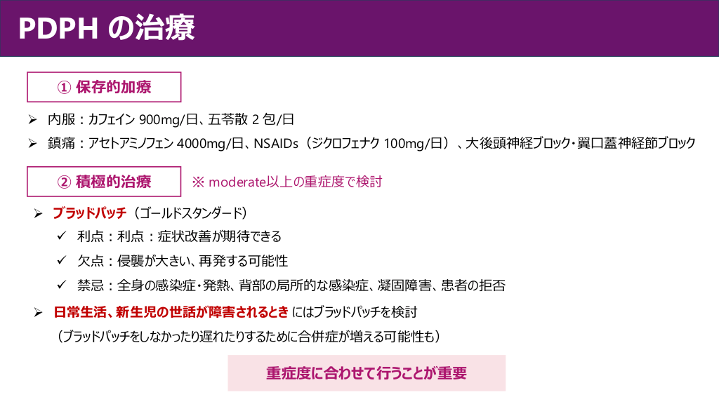 #13. PDPH の治療 ① 保存的加療 ➢ 内服:カフェイン 900mg/日、五苓散 2 包/日 ➢ 鎮痛:アセトアミノフェン 4000mg/日、NSAIDs(ジクロフェナク 100mg/日)、大後頭神経ブロック・翼口蓋神経節ブロック ② 積極的治療 ※ moderate以上の重症度で検討 ➢ ブラッドパッチ(ゴールドスタンダード) ✓ 利点:利点:症状改善が期待できる ✓ 欠点:侵襲が大きい、再発する可能性 ✓ 禁忌:全身の感染症・発熱、背部の局所的な感染症、凝固障害、患者の拒否 ➢ 日常生活、新生児の世話が障害されるとき にはブラッドパッチを検討 (ブラッドパッチをしなかったり遅れたりするために合併症が増える可能性も) 重症度に合わせて行うことが重要