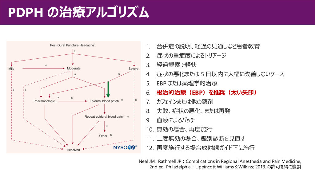 #14. PDPH の治療アルゴリズム 1. 合併症の説明、経過の見通しなど患者教育 2. 症状の重症度によるトリアージ 3. 経過観察で軽快 4. 症状の悪化または 5 日以内に大幅に改善しないケース 5. EBP または薬理学的治療 6. 根治的治療(EBP)を推奨(太い矢印) 7. カフェインまたは他の薬剤 8. 失敗、症状の悪化、または再発 9. 血液によるパッチ 10. 無効の場合、再度施行 11. 二度無効の場合、鑑別診断を見直す 12. 再度施行する場合放射線ガイド下に施行 Neal JM、Rathmell JP:Complications in Regional Anesthesia and Pain Medicine, 2nd ed. Philadelphia:Lippincott Williams&Wilkins; 2013. の許可を得て複製