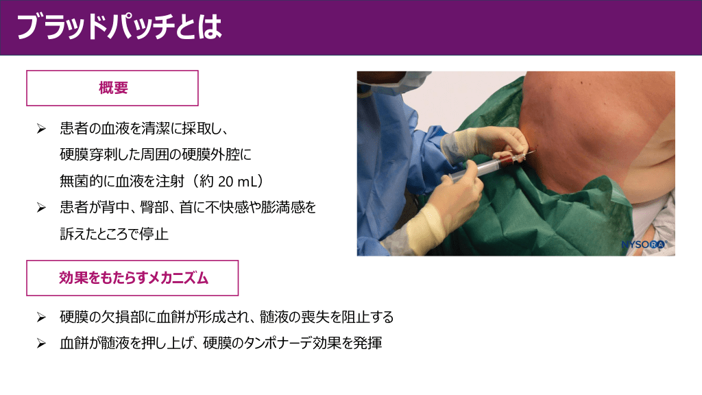 #15. ブラッドパッチとは 概要 ➢ 患者の血液を清潔に採取し、 硬膜穿刺した周囲の硬膜外腔に 無菌的に血液を注射(約 20 mL) ➢ 患者が背中、臀部、首に不快感や膨満感を 訴えたところで停止 効果をもたらすメカニズム ➢ 硬膜の欠損部に血餅が形成され、髄液の喪失を阻止する ➢ 血餅が髄液を押し上げ、硬膜のタンポナーデ効果を発揮
