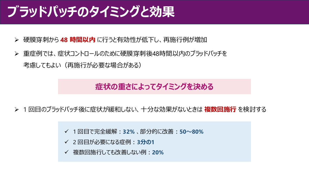 #17. ブラッドパッチのタイミングと効果 ➢ 硬膜穿刺から 48 時間以内 に行うと有効性が低下し、再施行例が増加 ➢ 重症例では、症状コントロールのために硬膜穿刺後48時間以内のブラッドパッチを 考慮してもよい(再施行が必要な場合がある) 症状の重さによってタイミングを決める ➢ 1 回目のブラッドパッチ後に症状が緩和しない、十分な効果がないときは 複数回施行 を検討する ✓ 1 回目で完全緩解:32% 、部分的に改善:50〜80% ✓ 2 回目が必要になる症例:3分の1 ✓ 複数回施行しても改善しない例:20%