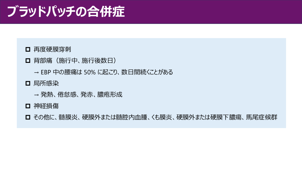 #18. ブラッドパッチの合併症 再度硬膜穿刺 背部痛(施行中、施行後数日) → EBP 中の腰痛は 50% に起こり、数日間続くことがある 局所感染 → 発熱、倦怠感、発赤、膿疱形成 神経損傷 その他に、髄膜炎、硬膜外または髄腔内血腫、くも膜炎、硬膜外または硬膜下膿瘍、馬尾症候群