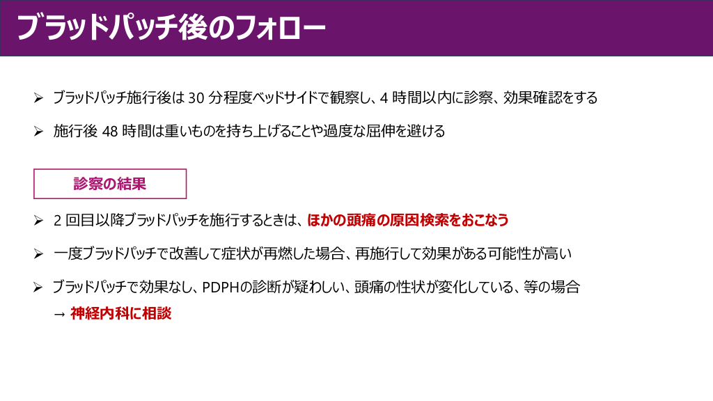 #19. ブラッドパッチ後のフォロー ➢ ブラッドパッチ施行後は 30 分程度ベッドサイドで観察し、4 時間以内に診察、効果確認をする ➢ 施行後 48 時間は重いものを持ち上げることや過度な屈伸を避ける 診察の結果 ➢ 2 回目以降ブラッドパッチを施行するときは、ほかの頭痛の原因検索をおこなう ➢ 一度ブラッドパッチで改善して症状が再燃した場合、再施行して効果がある可能性が高い ➢ ブラッドパッチで効果なし、PDPHの診断が疑わしい、頭痛の性状が変化している、等の場合 → 神経内科に相談
