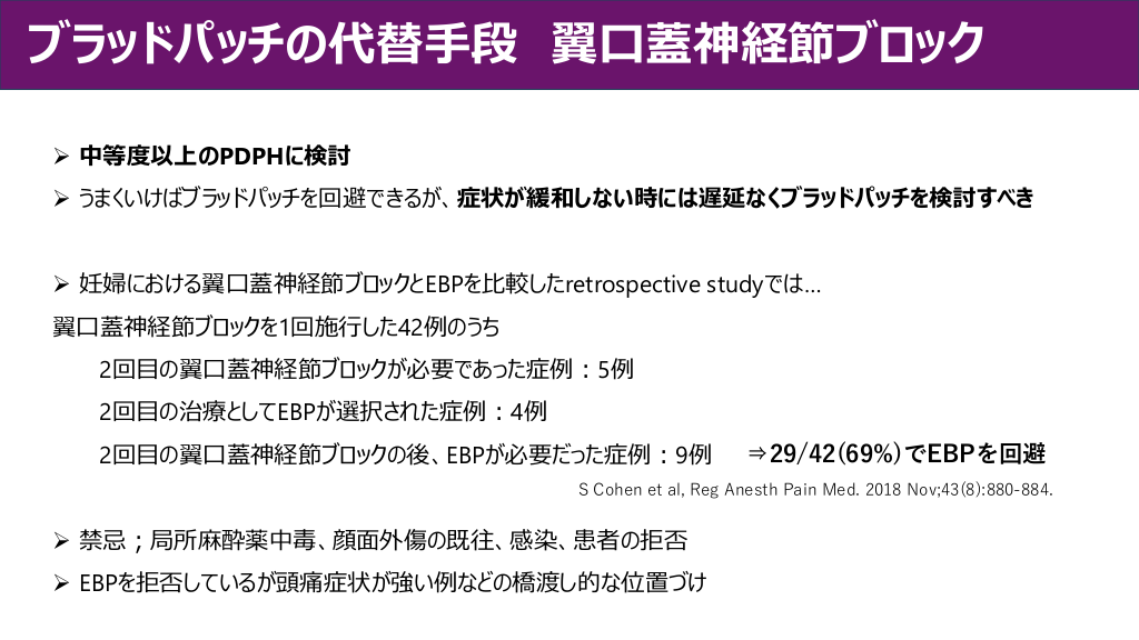 #20. ブラッドパッチの代替手段 翼口蓋神経節ブロック ➢ 中等度以上のPDPHに検討 ➢ うまくいけばブラッドパッチを回避できるが、症状が緩和しない時には遅延なくブラッドパッチを検討すべき ➢ 妊婦における翼口蓋神経節ブロックとEBPを比較したretrospective studyでは… 翼口蓋神経節ブロックを1回施行した42例のうち 2回目の翼口蓋神経節ブロックが必要であった症例:5例 2回目の治療としてEBPが選択された症例:4例 2回目の翼口蓋神経節ブロックの後、EBPが必要だった症例:9例 ⇒29/42(69%)でEBPを回避 S Cohen et al, Reg Anesth Pain Med. 2018 Nov;43(8):880-884. ➢ 禁忌;局所麻酔薬中毒、顔面外傷の既往、感染、患者の拒否 ➢ EBPを拒否しているが頭痛症状が強い例などの橋渡し的な位置づけ