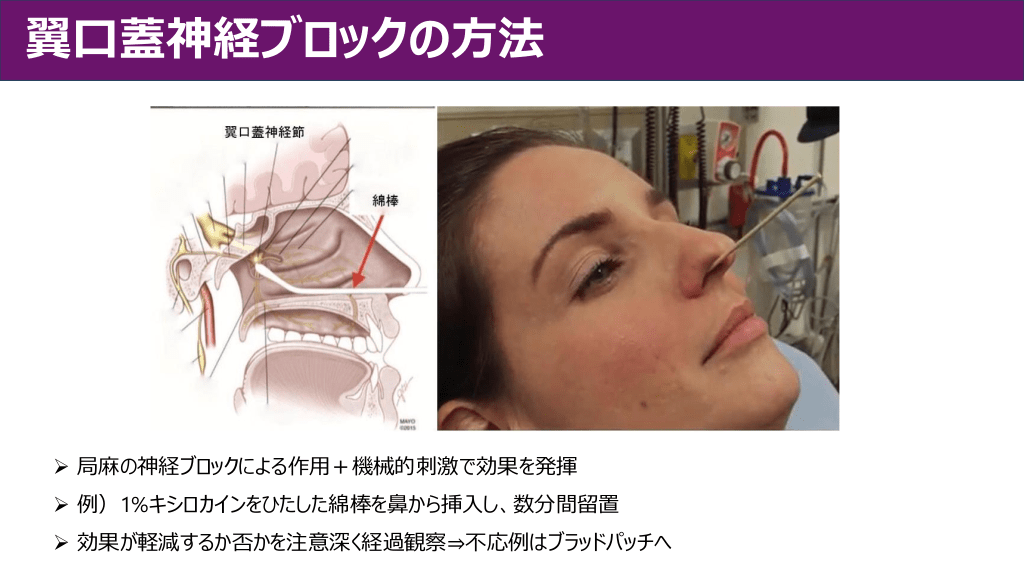 #21. 翼口蓋神経ブロックの方法 ➢ 局麻の神経ブロックによる作用+機械的刺激で効果を発揮 ➢ 例)1%キシロカインをひたした綿棒を鼻から挿入し、数分間留置 ➢ 効果が軽減するか否かを注意深く経過観察⇒不応例はブラッドパッチへ