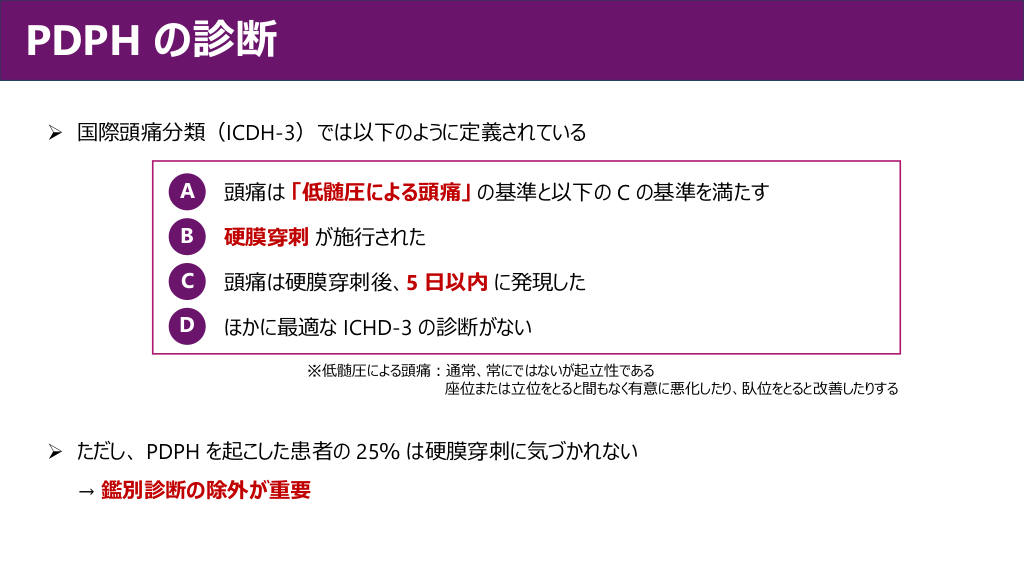 #3. PDPH の診断 ➢ 国際頭痛分類(ICDH-3)では以下のように定義されている A 頭痛は 「低髄圧による頭痛」 の基準と以下の C の基準を満たす B 硬膜穿刺 が施行された C 頭痛は硬膜穿刺後、5 日以内 に発現した D ほかに最適な ICHD-3 の診断がない ※低髄圧による頭痛:通常、常にではないが起立性である 座位または立位をとると間もなく有意に悪化したり、臥位をとると改善したりする ➢ ただし、 PDPH を起こした患者の 25% は硬膜穿刺に気づかれない → 鑑別診断の除外が重要