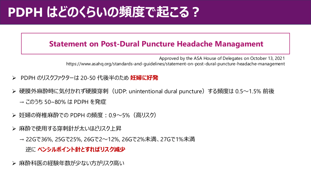 #6. PDPH はどのくらいの頻度で起こる? Statement on Post-Dural Puncture Headache Managament Approved by the ASA House of Delegates on October 13, 2021 https://www.asahq.org/standards-and-guidelines/statement-on-post-dural-puncture-headache-management ➢ PDPH のリスクファクターは 20-50 代後半のため 妊婦に好発 ➢ 硬膜外麻酔時に気付かれず硬膜穿刺(UDP: unintentional dural puncture)する頻度は 0.5〜1.5% 前後 → このうち 50~80% は PDPH を発症 ➢ 妊婦の脊椎麻酔での PDPH の頻度:0.9〜5%(高リスク) ➢ 麻酔で使用する穿刺針が太いほどリスク上昇 → 22Gで36%, 25Gで25%, 26Gで2〜12%, 26Gで2%未満、27Gで1%未満 逆に ペンシルポイント針とすればリスク減少 ➢ 麻酔科医の経験年数が少ない方がリスク高い