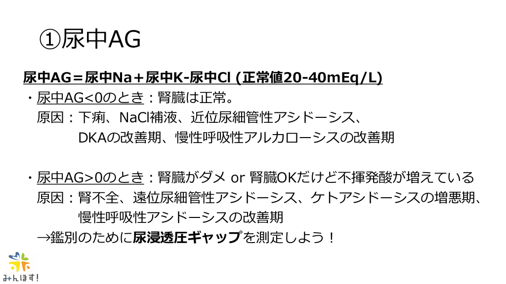 #101. ①尿中AG 尿中AG=尿中Na+尿中K-尿中Cl (正常値20-40mEq/L) ・尿中AG<0のとき:腎臓は正常。 原因:下痢、NaCl補液、近位尿細管性アシドーシス、 DKAの改善期、慢性呼吸性アルカローシスの改善期 ・尿中AG>0のとき:腎臓がダメ or 腎臓OKだけど不揮発酸が増えている 原因:腎不全、遠位尿細管性アシドーシス、ケトアシドーシスの増悪期、 慢性呼吸性アシドーシスの改善期 →鑑別のために尿浸透圧ギャップを測定しよう!