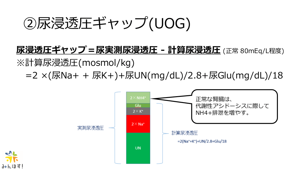 #102. ②尿浸透圧ギャップ(UOG) 尿浸透圧ギャップ=尿実測尿浸透圧 - 計算尿浸透圧 (正常 80mEq/L程度) ※計算尿浸透圧(mosmol/kg) =2 ×(尿Na+ + 尿K+)+尿UN(mg/dL)/2.8+尿Glu(mg/dL)/18 正常な腎臓は、 代謝性アシドーシスに際して NH4+排泄を増やす。