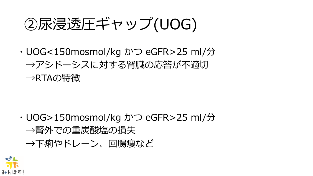 #103. ②尿浸透圧ギャップ(UOG) ・UOG<150mosmol/kg かつ eGFR>25 ml/分 →アシドーシスに対する腎臓の応答が不適切 →RTAの特徴 ・UOG>150mosmol/kg かつ eGFR>25 ml/分 →腎外での重炭酸塩の損失 →下痢やドレーン、回腸瘻など
