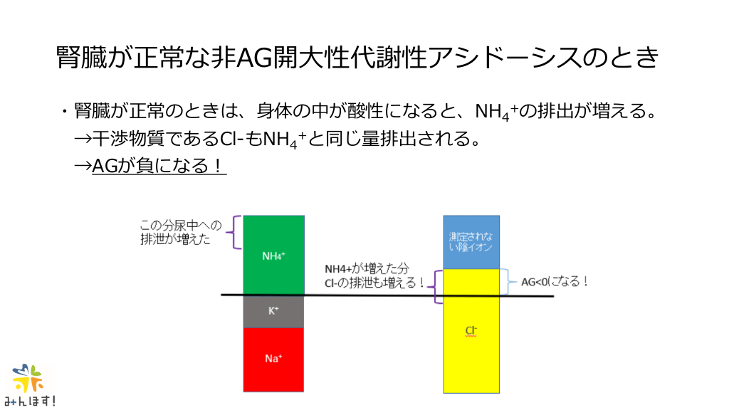 #106. 腎臓が正常な非AG開大性代謝性アシドーシスのとき ・腎臓が正常のときは、身体の中が酸性になると、NH4+の排出が増える。 →干渉物質であるCl-もNH4+と同じ量排出される。 →AGが負になる!