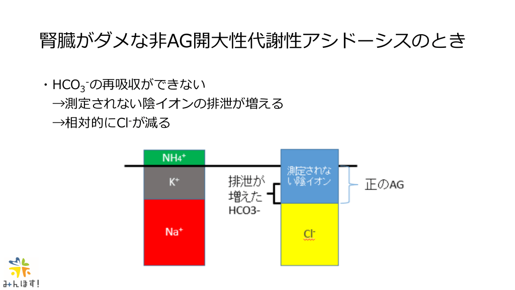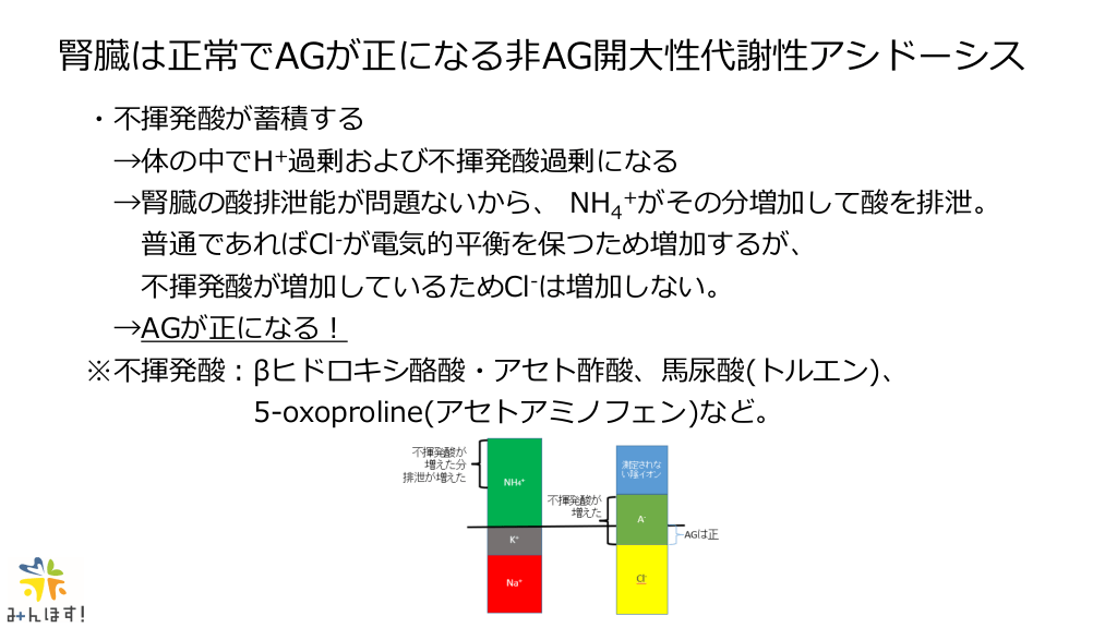 #107. 腎臓は正常でAGが正になる非AG開大性代謝性アシドーシス ・不揮発酸が蓄積する →体の中でH+過剰および不揮発酸過剰になる →腎臓の酸排泄能が問題ないから、 NH4+がその分増加して酸を排泄。 普通であればCl-が電気的平衡を保つため増加するが、 不揮発酸が増加しているためCl-は増加しない。 →AGが正になる! ※不揮発酸:βヒドロキシ酪酸・アセト酢酸、馬尿酸(トルエン)、 5-oxoproline(アセトアミノフェン)など。