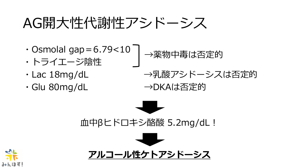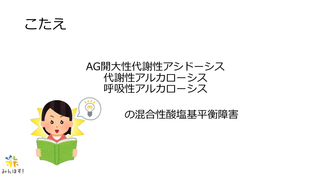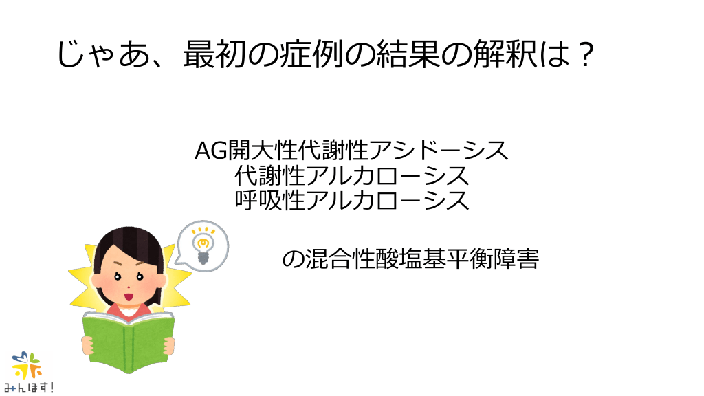 #119. じゃあ、最初の症例の結果の解釈は? AG開大性代謝性アシドーシス 代謝性アルカローシス 呼吸性アルカローシス の混合性酸塩基平衡障害