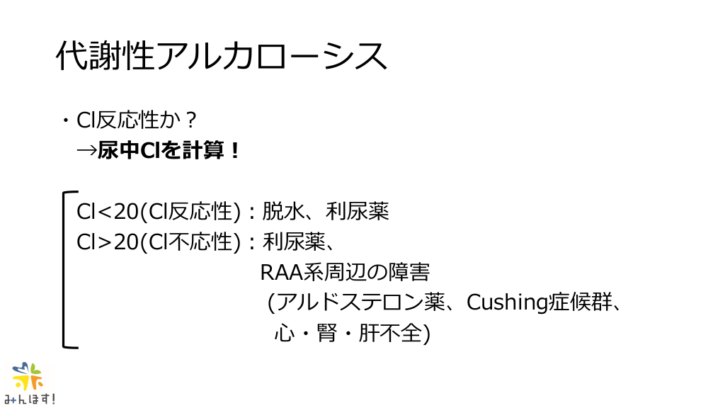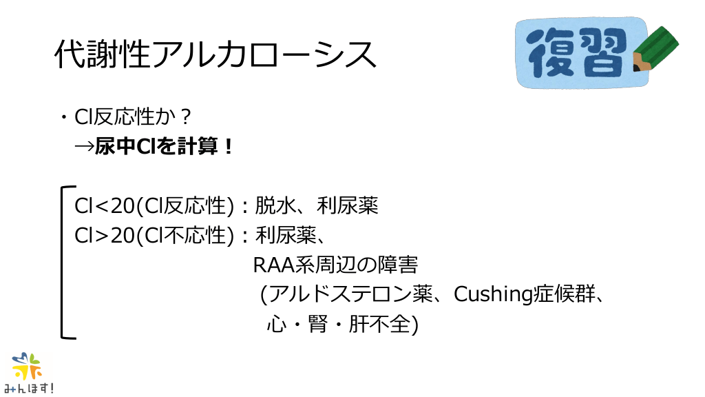 #113. 代謝性アルカローシス ・Cl反応性か? →尿中Clを計算! Cl<20(Cl反応性):脱水、利尿薬 Cl>20(Cl不応性):利尿薬、 RAA系周辺の障害 (アルドステロン薬、Cushing症候群、 心・腎・肝不全)