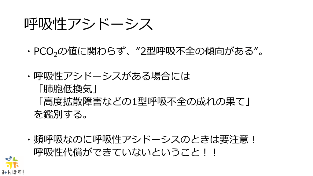 #115. 呼吸性アシドーシス ・PCO2の値に関わらず、”2型呼吸不全の傾向がある”。 ・呼吸性アシドーシスがある場合には 「肺胞低換気」 「高度拡散障害などの1型呼吸不全の成れの果て」 を鑑別する。 ・頻呼吸なのに呼吸性アシドーシスのときは要注意! 呼吸性代償ができていないということ!!