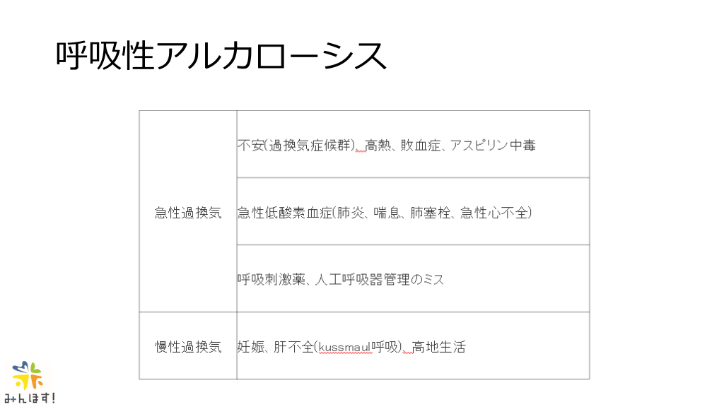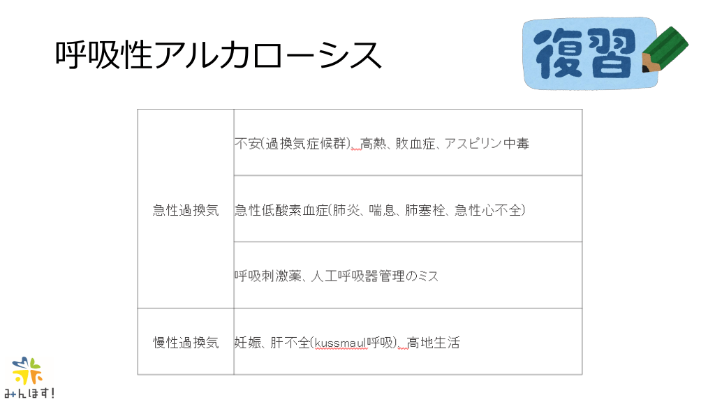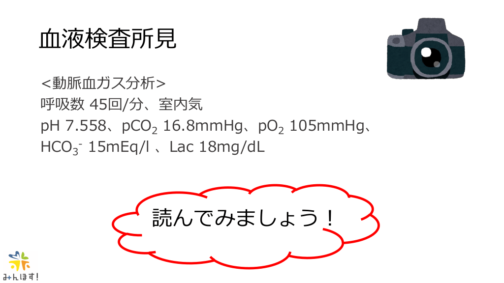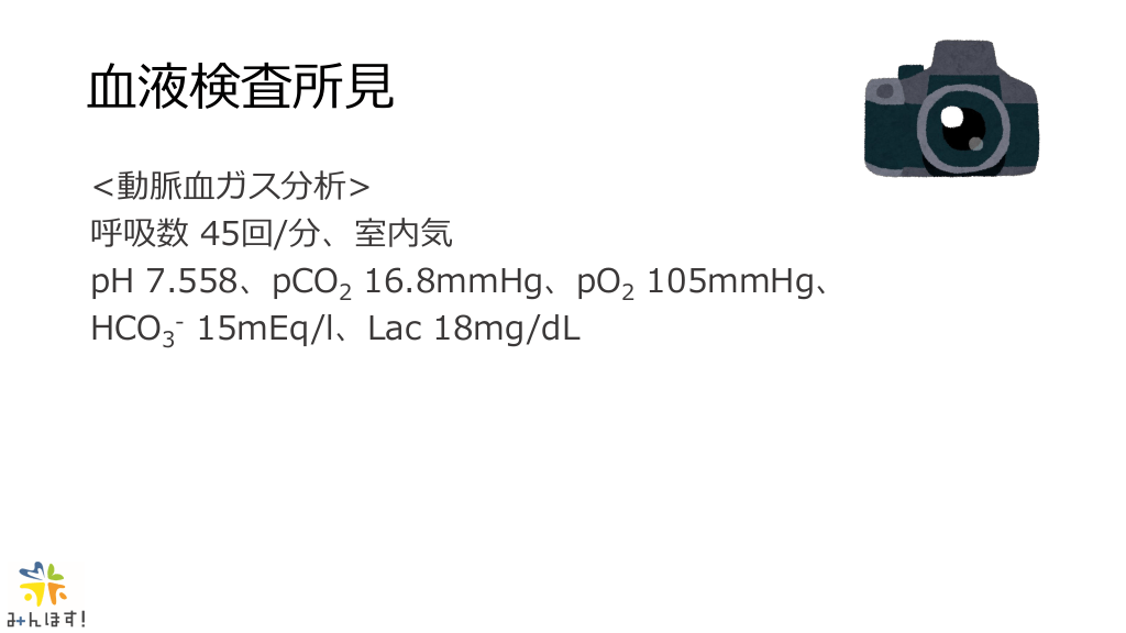 #80. 血液検査所見 <動脈血ガス分析> 呼吸数 45回/分、室内気 pH 7.558、pCO2 16.8mmHg、pO2 105mmHg、 HCO3- 15mEq/l、Lac 18mg/dL 読んでみましょう!