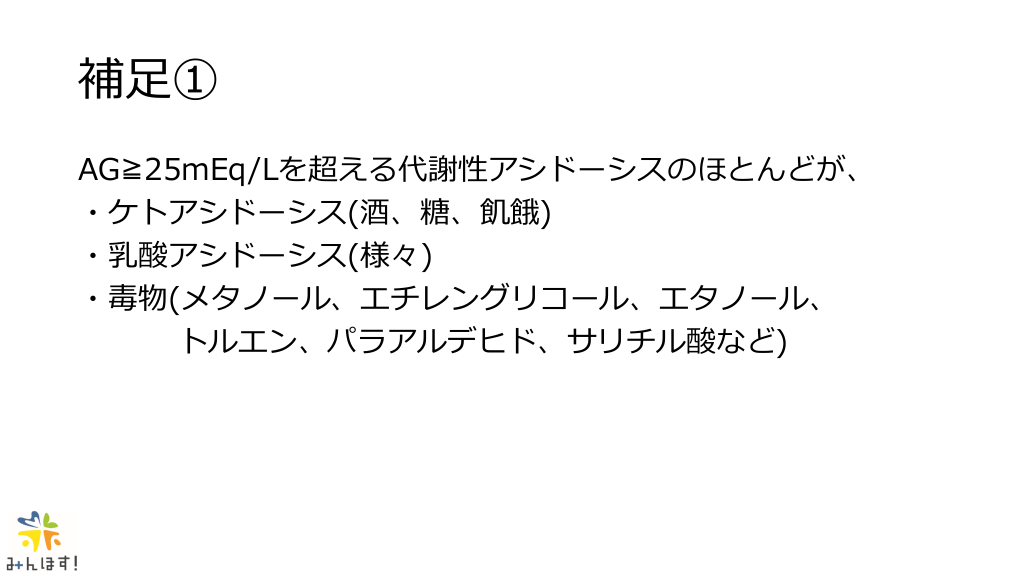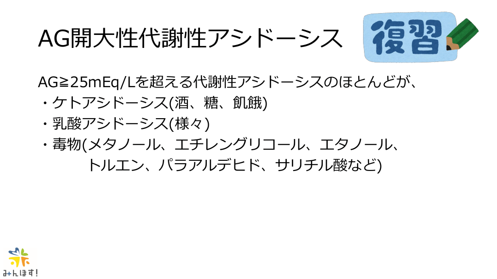 #94. 補足① AG≧25mEq/Lを超える代謝性アシドーシスのほとんどが、 ・ケトアシドーシス(酒、糖、飢餓) ・乳酸アシドーシス(様々) ・毒物(メタノール、エチレングリコール、エタノール、 トルエン、パラアルデヒド、サリチル酸など)