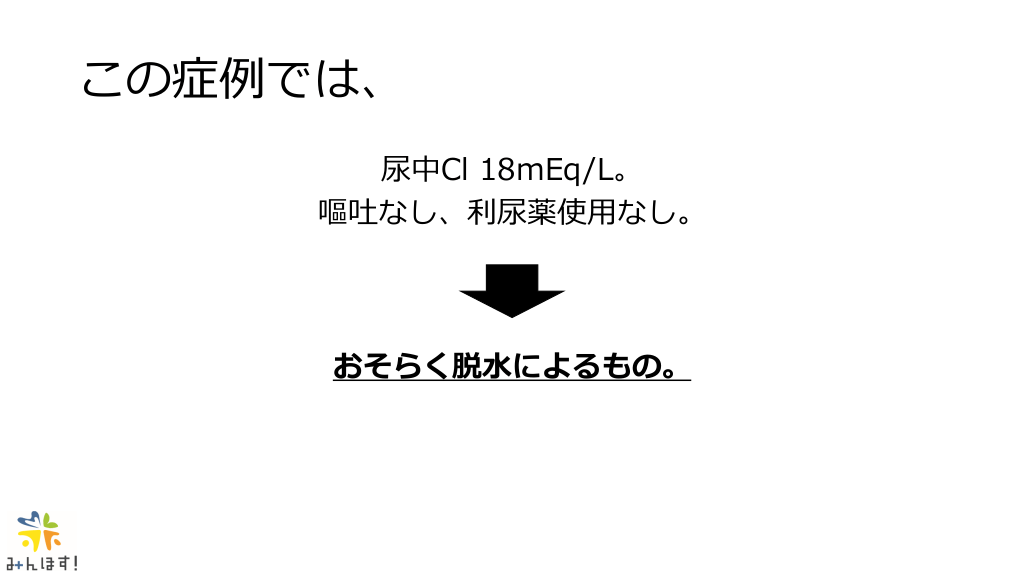 #124. この症例では、 尿中Cl 18mEq/L。 嘔吐なし、利尿薬使用なし。 おそらく脱水によるもの。