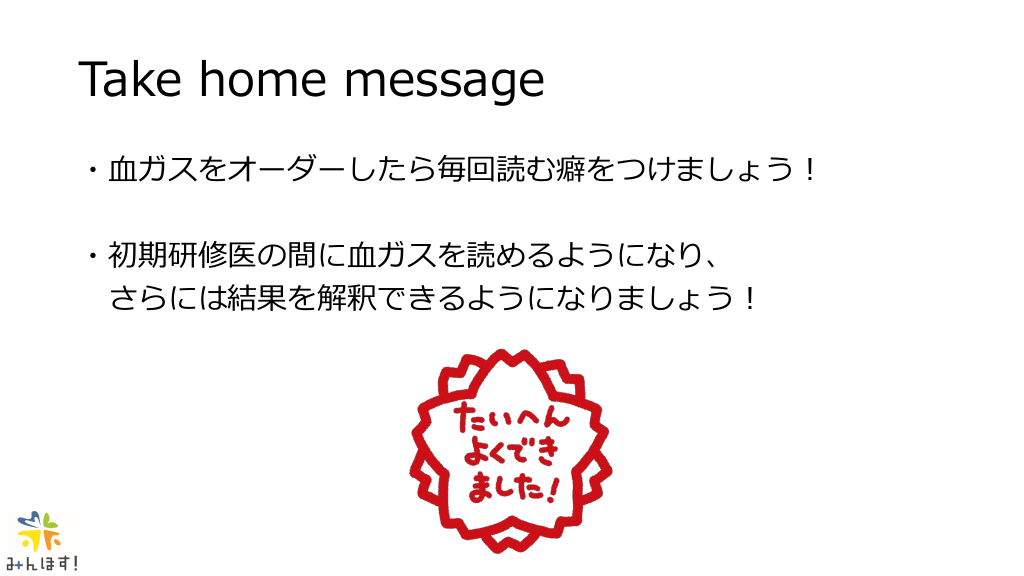 #128. Take home message ・血ガスをオーダーしたら毎回読む癖をつけましょう! ・初期研修医の間に血ガスを読めるようになり、 さらには結果を解釈できるようになりましょう!