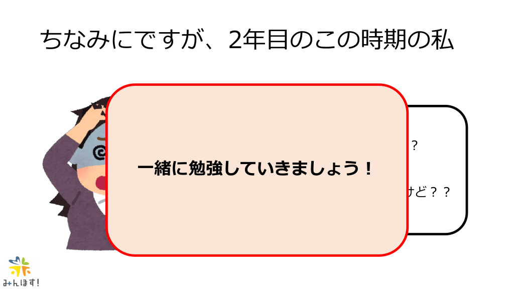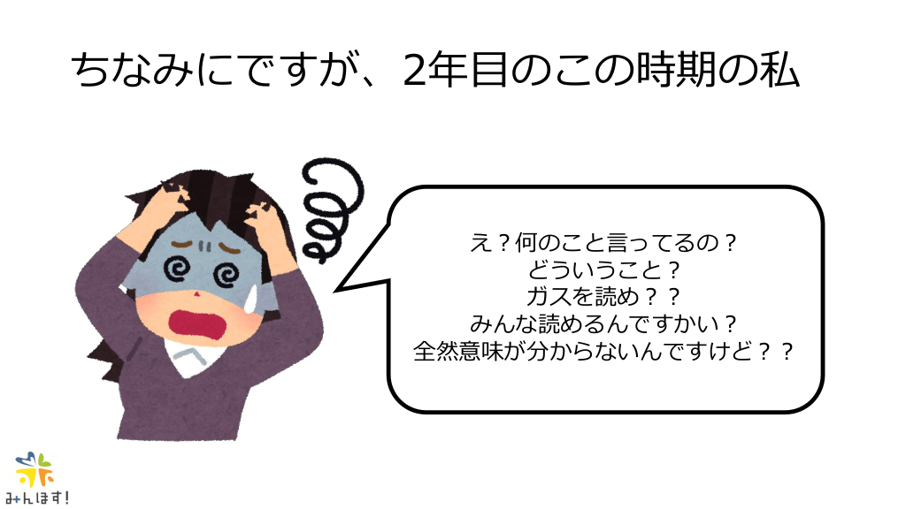 #14. ちなみにですが、2年目のこの時期の私 え?何のこと言ってるの? どういうこと? 一緒に勉強していきましょう! ガスを読め?? 全然意味が分からないんですけど??