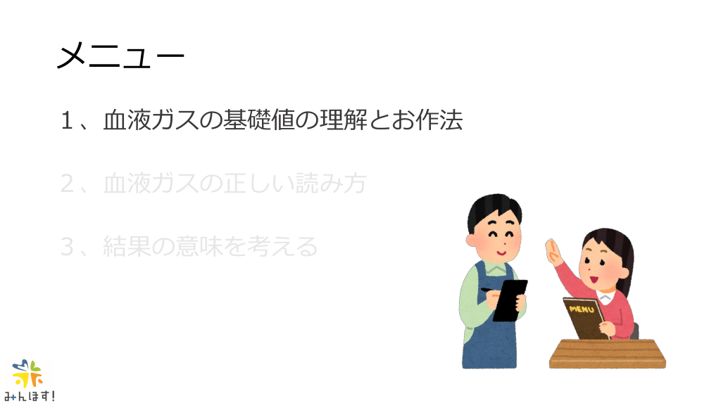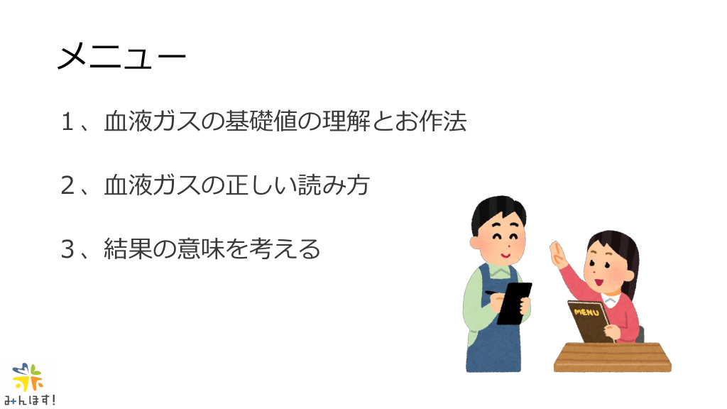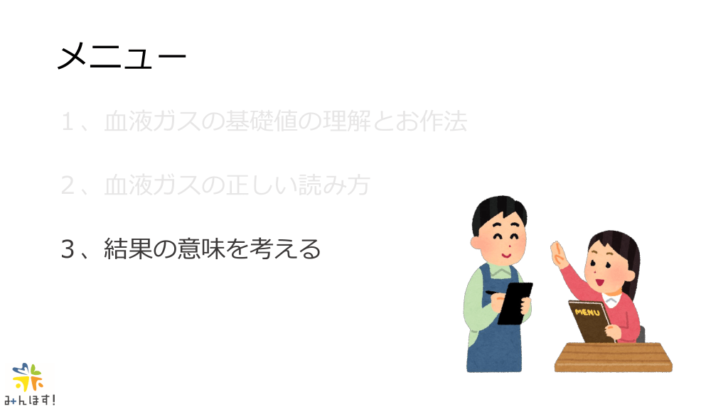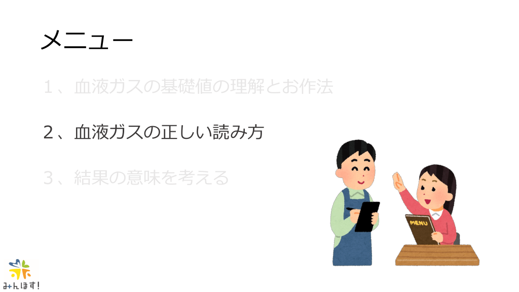 #25. メニュー 1、血液ガスの基礎値の理解とお作法 2、血液ガスの正しい読み方 3、結果の意味を考える