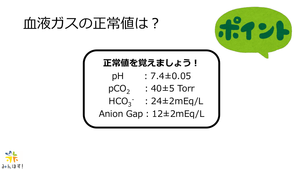 #20. 血液ガスの正常値は? 正常値を覚えましょう! pH :7.4±0.05 pCO2 :40±5 Torr HCO3- :24±2mEq/L Anion Gap:12±2mEq/L