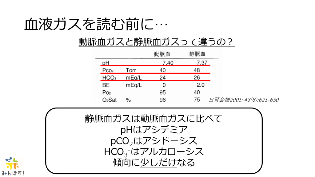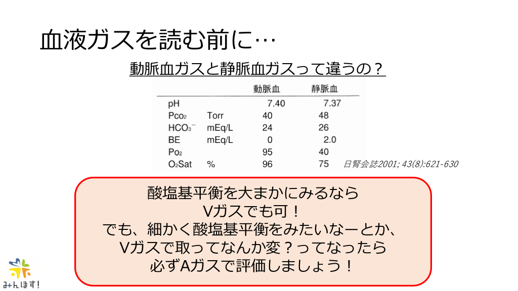 #23. 血液ガスを読む前に… 動脈血ガスと静脈血ガスって違うの? 日腎会誌2001; 43(8):621-630 酸塩基平衡を大まかにみるなら Vガスでも可! でも、細かく酸塩基平衡をみたいなーとか、 Vガスで取ってなんか変?ってなったら 必ずAガスで評価しましょう!