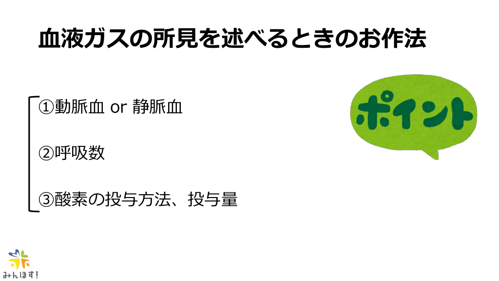#24. 血液ガスの所見を述べるときのお作法 ①動脈血 or 静脈血 ②呼吸数 ③酸素の投与方法、投与量