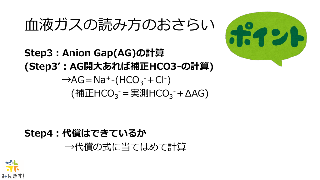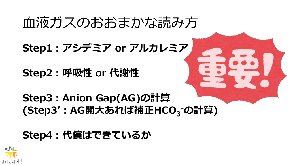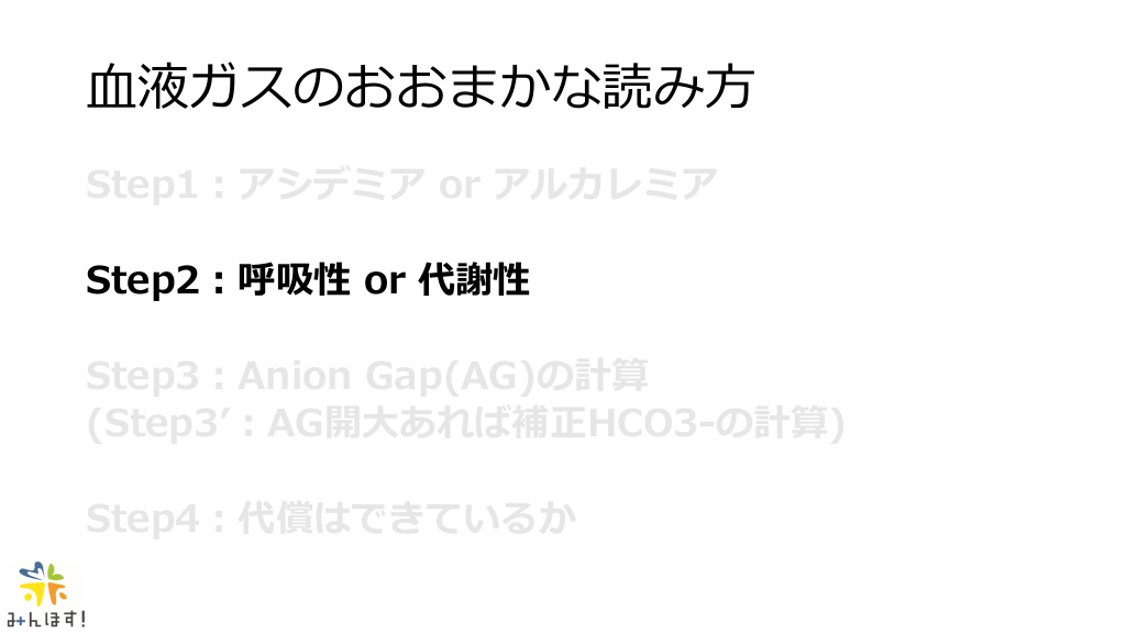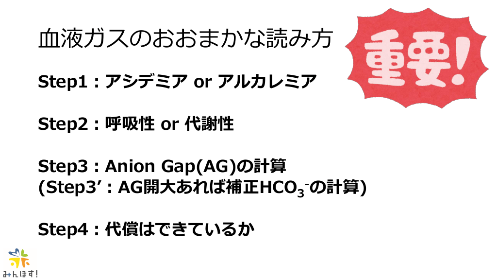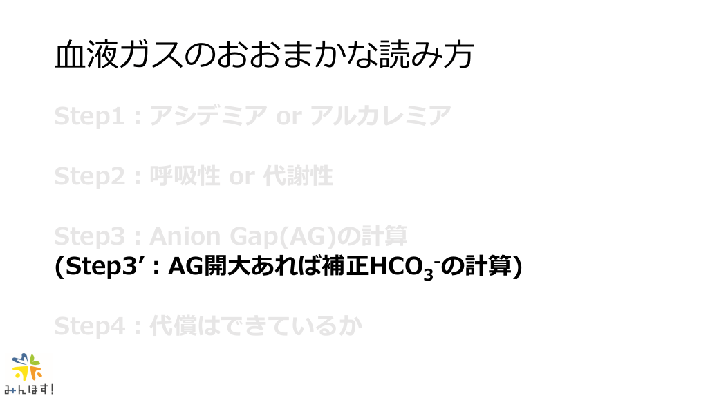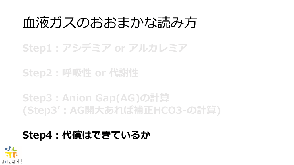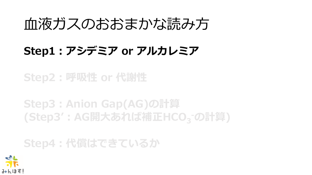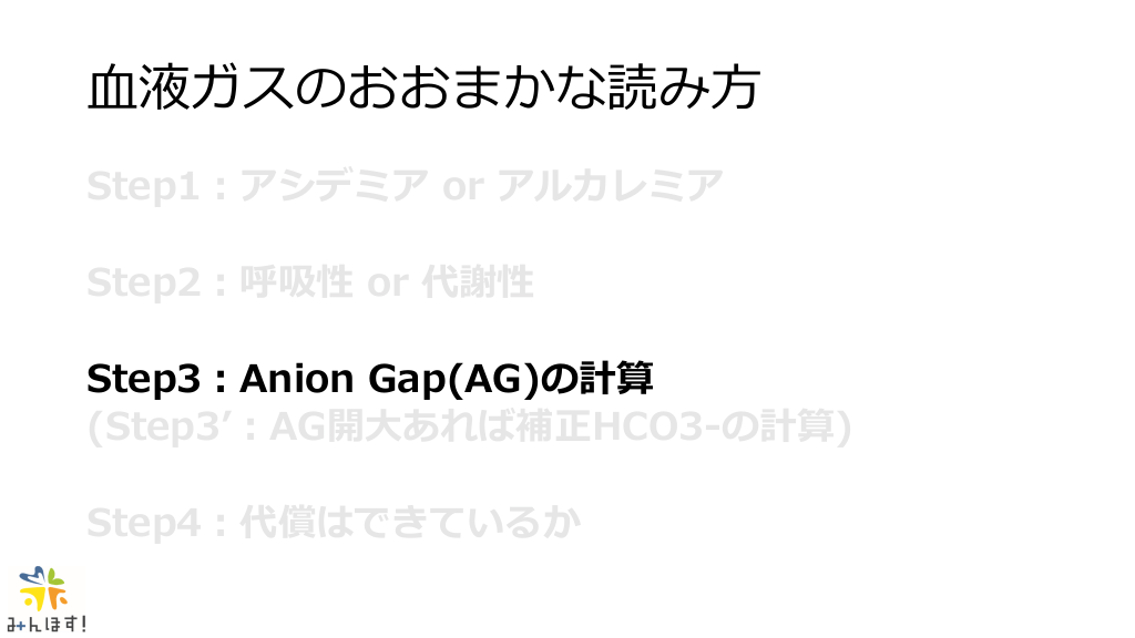 #68. 血液ガスのおおまかな読み方 Step1:アシデミア or アルカレミア Step2:呼吸性 or 代謝性 Step3:Anion Gap(AG)の計算 (Step3’:AG開大あれば補正HCO3-の計算) Step4:代償はできているか