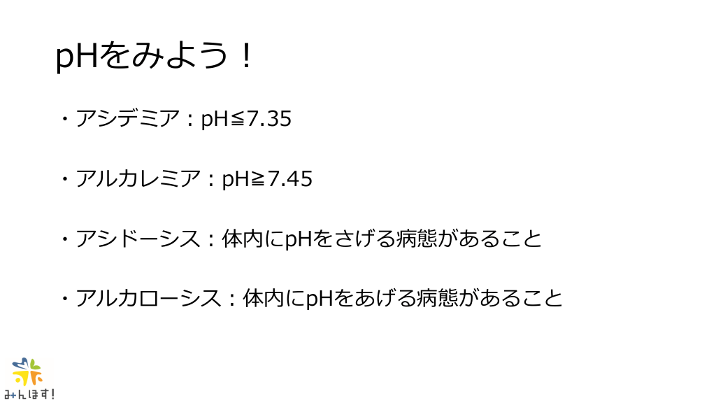 #28. pHをみよう! ・アシデミア:pH≦7.35 ・アルカレミア:pH≧7.45 ・アシドーシス:体内にpHをさげる病態があること ・アルカローシス:体内にpHをあげる病態があること