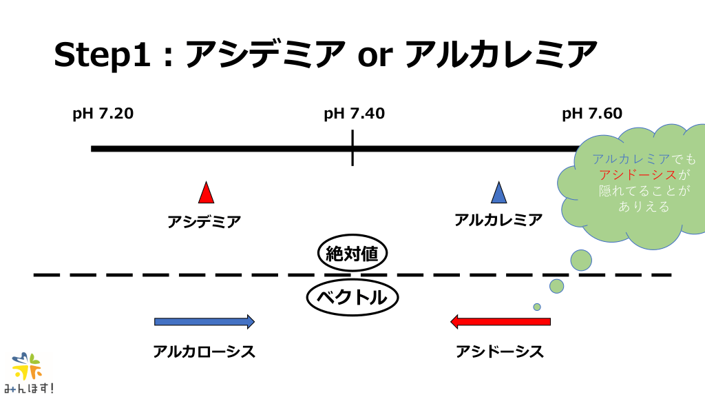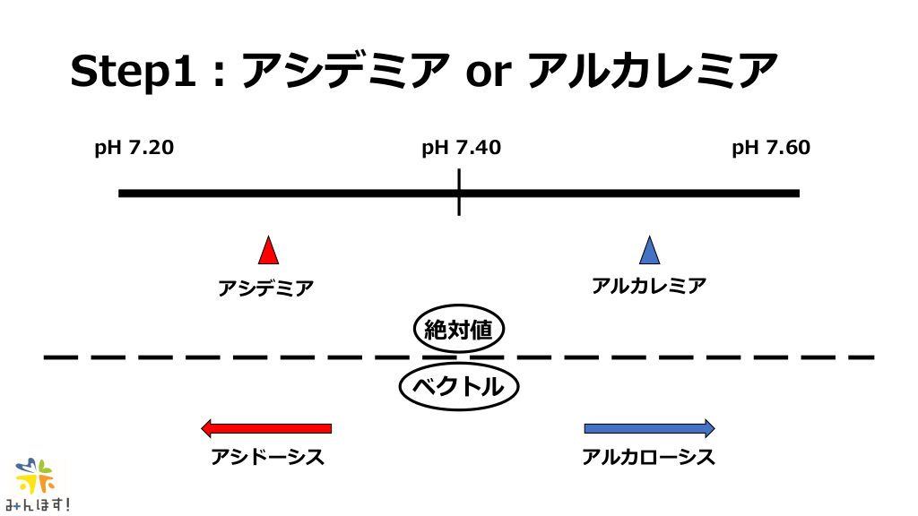 #30. Step1:アシデミア or アルカレミア pH 7.40 pH 7.20 pH 7.60 アルカレミア アシデミア 絶対値 ベクトル アシドーシス アルカローシス