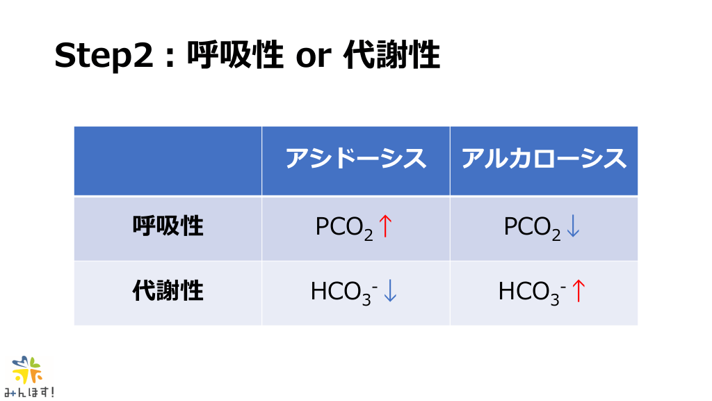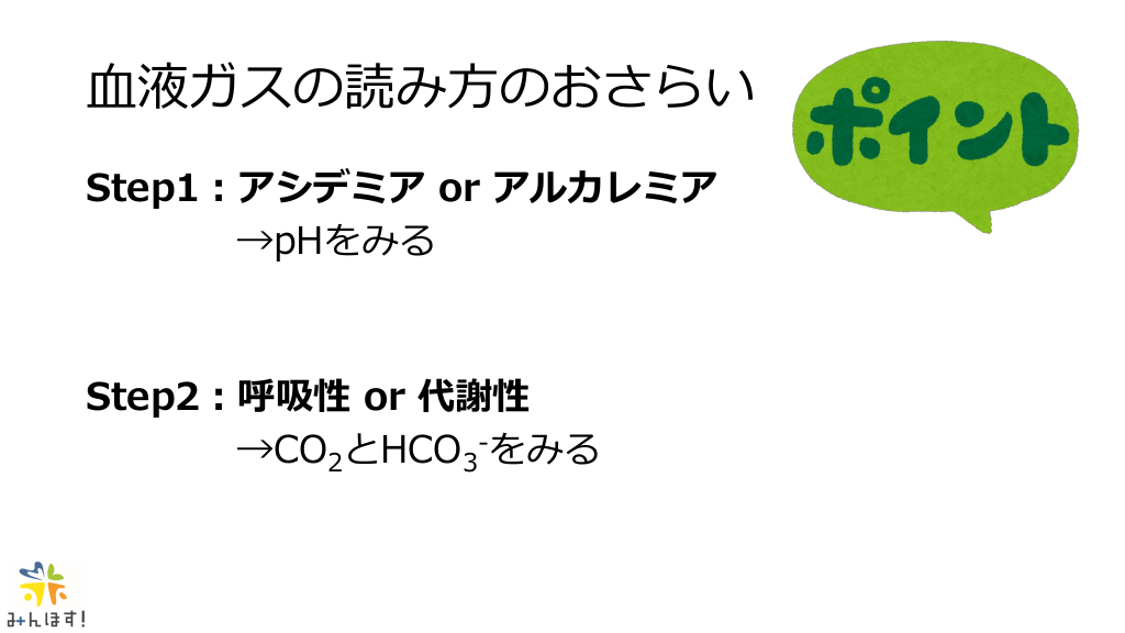#73. 血液ガスの読み方のおさらい Step1:アシデミア or アルカレミア →pHをみる Step2:呼吸性 or 代謝性 →CO2とHCO3-をみる
