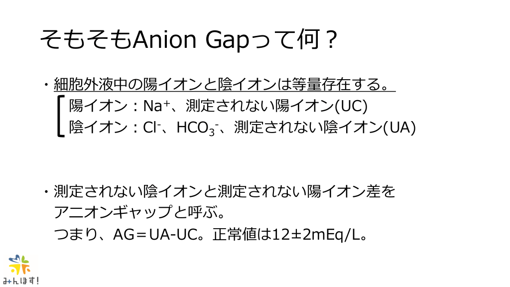 #36. そもそもAnion Gapって何? ・細胞外液中の陽イオンと陰イオンは等量存在する。 陽イオン:Na+、測定されない陽イオン(UC) 陰イオン:Cl-、HCO3-、測定されない陰イオン(UA) ・測定されない陰イオンと測定されない陽イオン差を アニオンギャップと呼ぶ。 つまり、AG=UA-UC。正常値は12±2mEq/L。