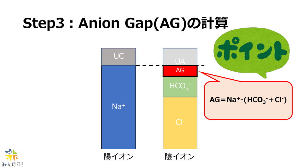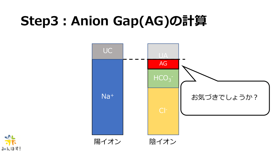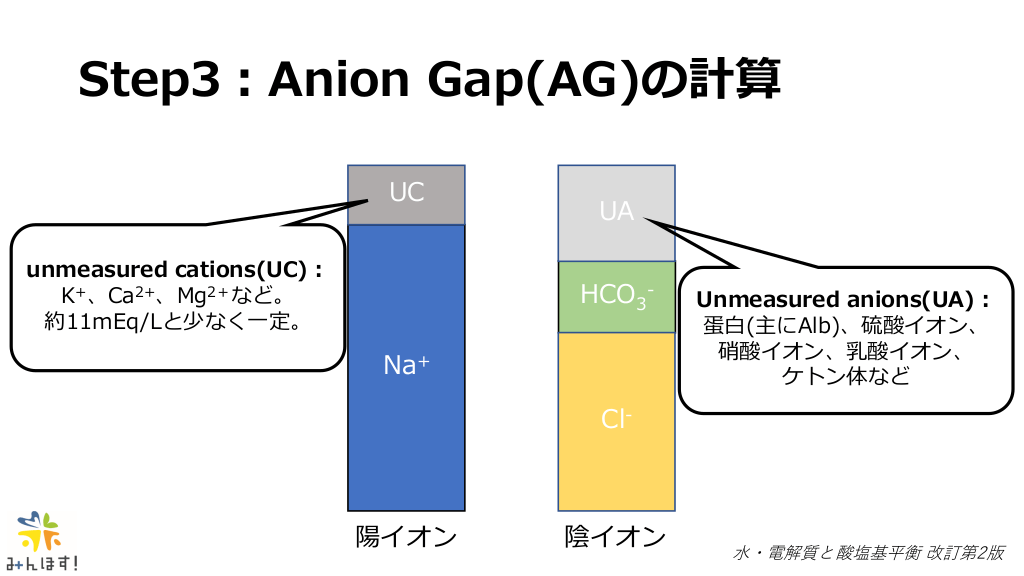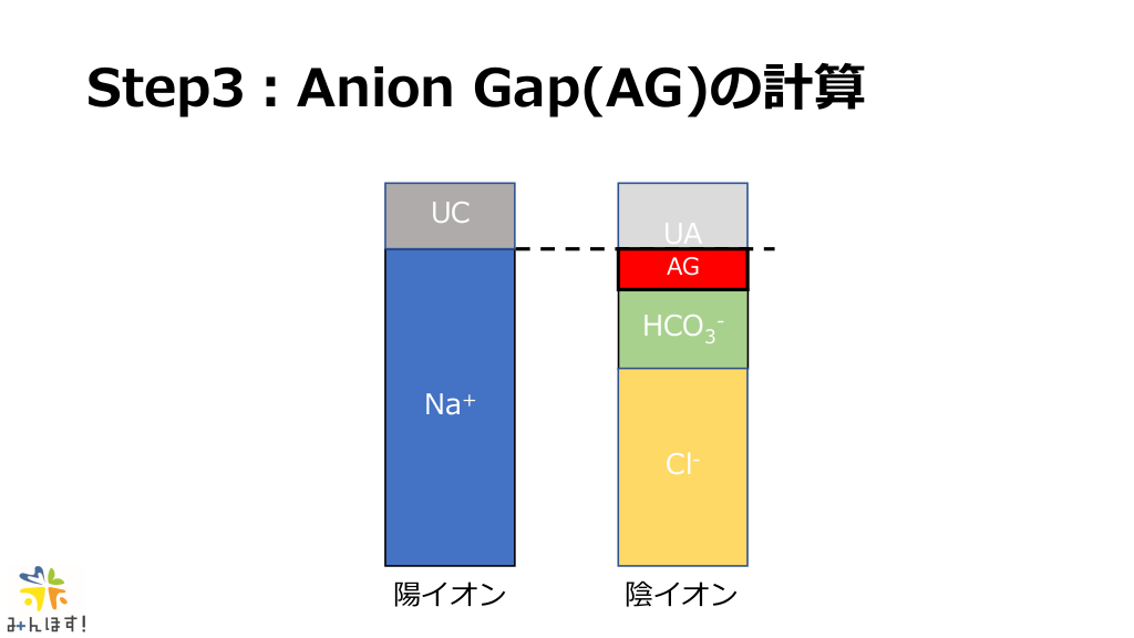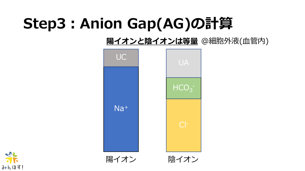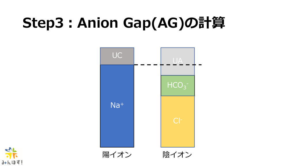 #40. Step3:Anion Gap(AG)の計算 UC UA HCO3- Na+ Cl- 陽イオン 陰イオン