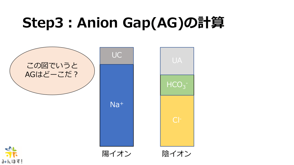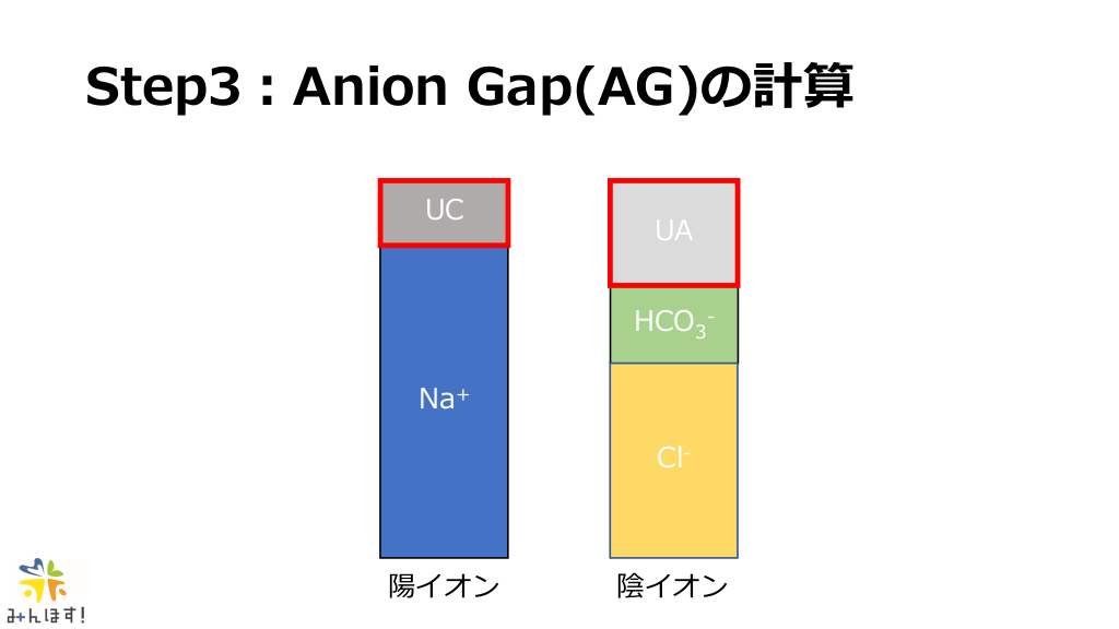 #41. Step3:Anion Gap(AG)の計算 UC UA HCO3- Na+ Cl- 陽イオン 陰イオン