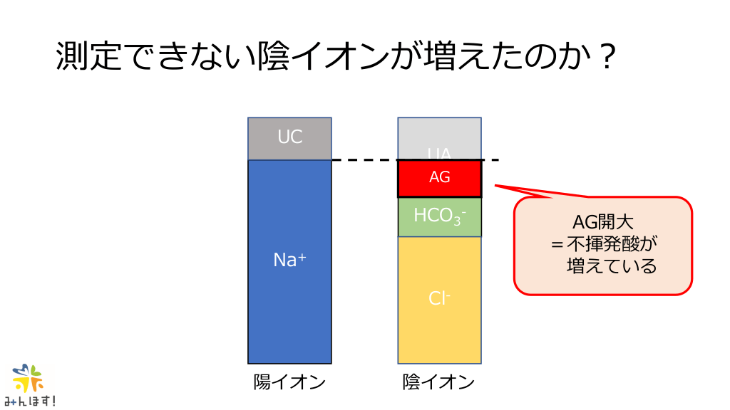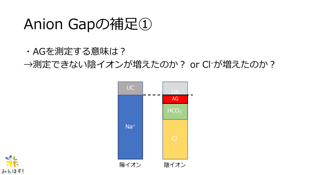 #45. Anion Gapの補足① ・AGを測定する意味は? →測定できない陰イオンが増えたのか? or Cl-が増えたのか?