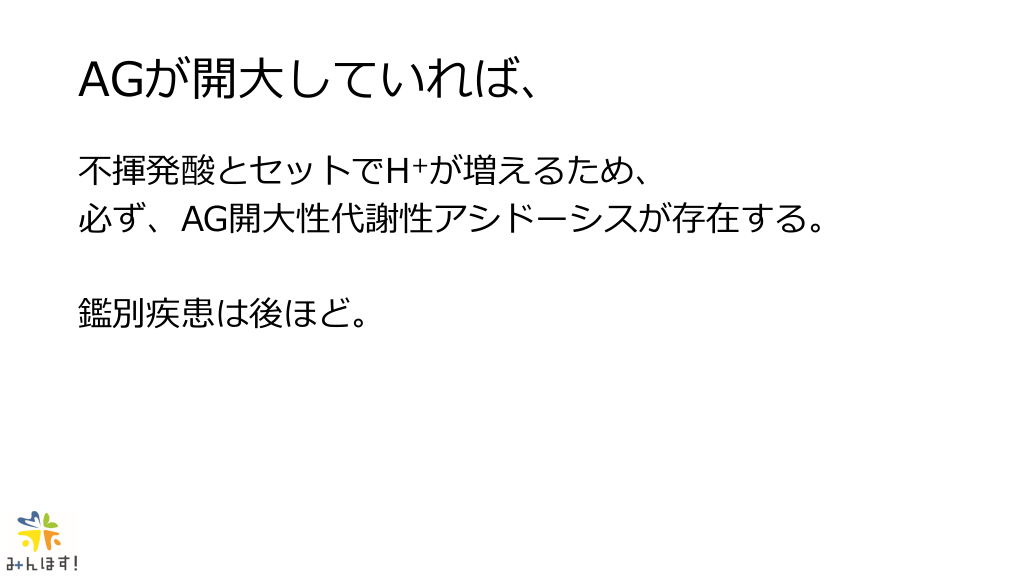 #49. AGが開大していれば、 不揮発酸とセットでH+が増えるため、 必ず、AG開大性代謝性アシドーシスが存在する。 鑑別疾患は後ほど。
