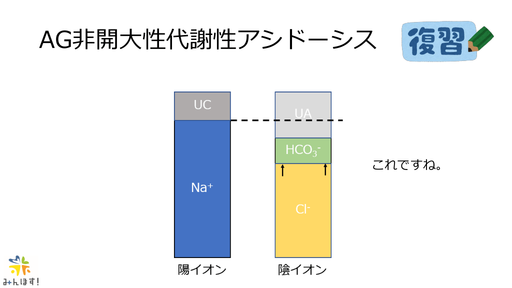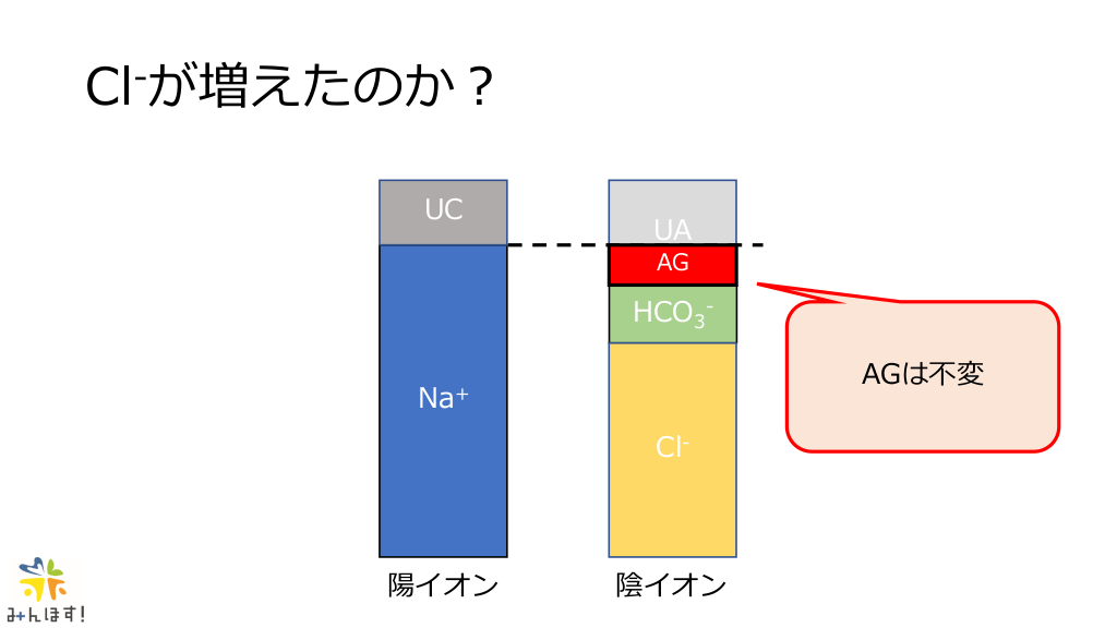 #52. Cl-が増えたのか? UC UA AG HCO3- AGは不変 Na+ Cl- 陽イオン 陰イオン